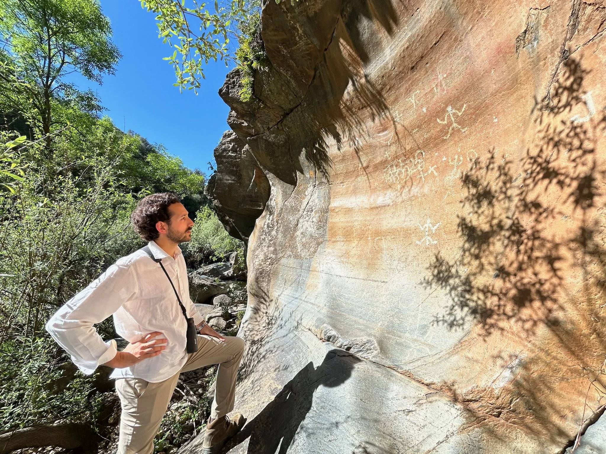 La piedra en sí era cóncava, alisada por las crecidas, y de cinco o seis metros de altura. Lo que los expertos llamarían un “abrigo rocoso”. Debajo, al pie de la pared, la sensación se asemejaba a la de estar en una capilla. Mirando a la pared, las pinturas te envuelven, te rodean. Al darles la espalda, te protegen, pero su presencia te afirma que su contraparte, su espejo, ese rincón del río, es igual de importante.