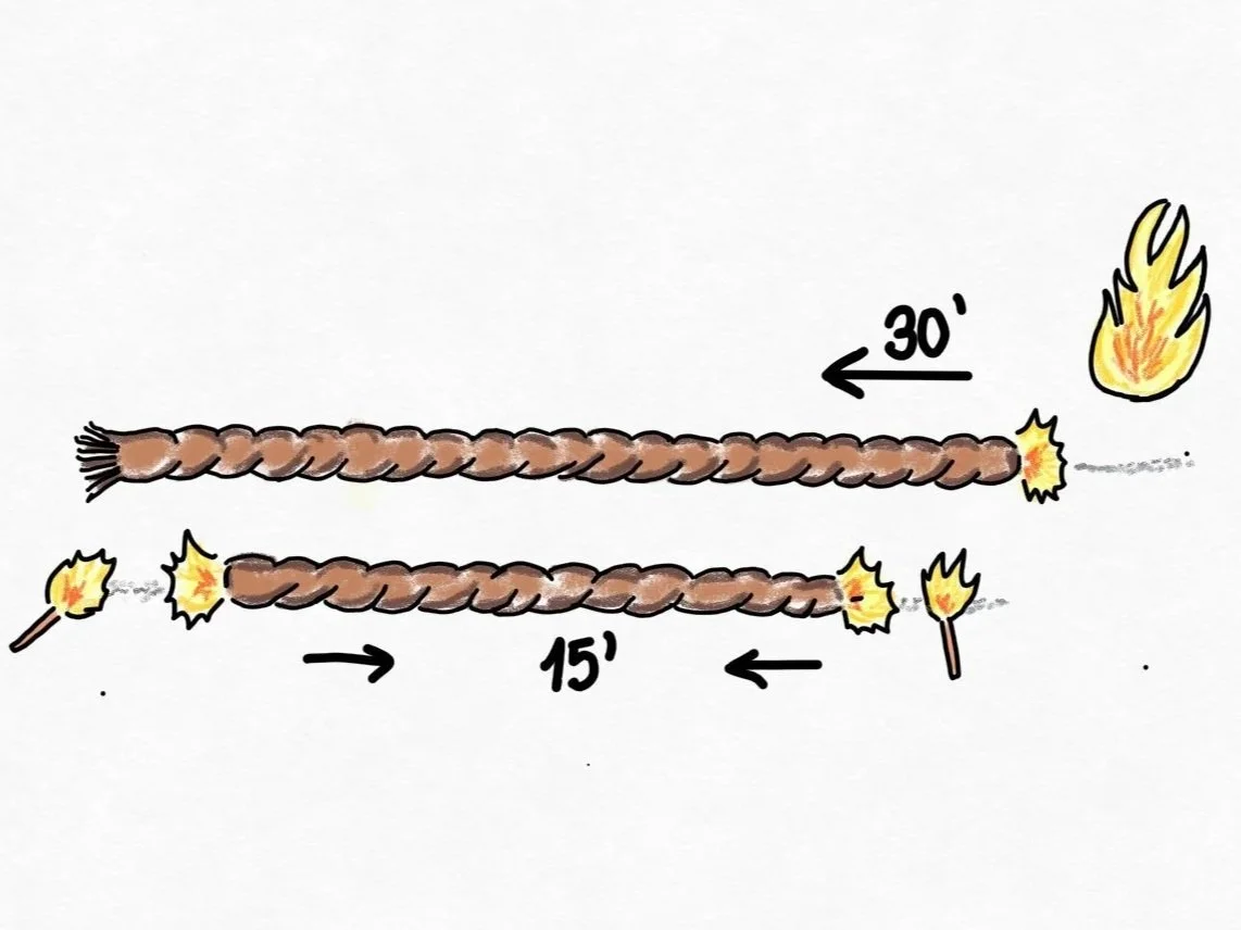Entonces encendió la segunda cuerda por uno de los extremos únicamente. De esa manera, toda ella se consumiría en 30 minutos más.